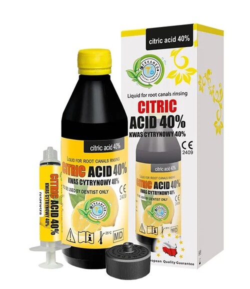 Cerkamed Citric Acid 40% er en endodontisk skyllevæske beregnet til skylning af rodkanaler under rodbehandling. Produktet understøtter den mekaniske rensning af kanalen ved at fjerne smear layer, så dentintubuli eksponeres og kan rengøres mere effektivt.