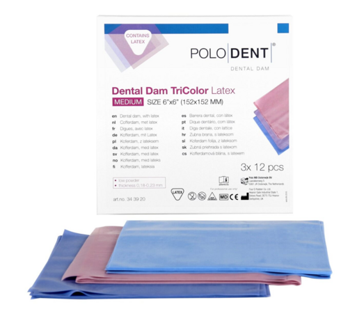 PoloDent TriColor kofferdam indholer latex og har et lavt pudderindhold. Kommer i 3 farver (TriColor).