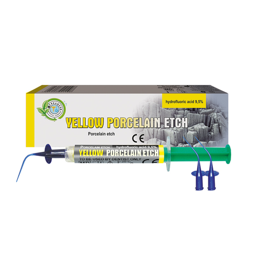 Yellow Porcelain Etch anvendes til porcelænsætsning ved reparation af protetiske restaureringer og til ætsning af porcelænsfacader, kroner eller inlays og onlays før cementering.