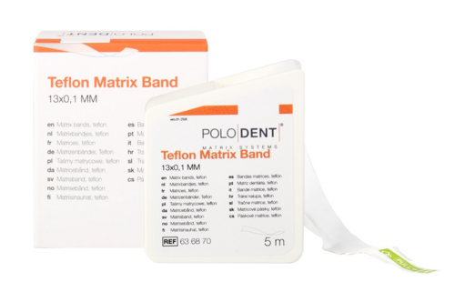 PoloDent Teflon matricebånd på rulle i en praktisk dispenser hjælper med at reducere gingival overhæng og genopretter det proximale kontaktpunkt. Gør det muligt at genoprette tilstødende kontaktpunkter effektivt; Gendanner effektivt den manglende tandform og fungerer med interdentalkilen;