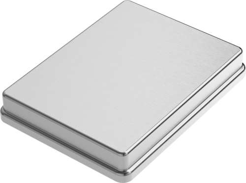 Mål: 14,4 cm x 18,7 cm x 2,9 cm. Uperforeret. Sølvfarvet. Anodiseret aluminium.