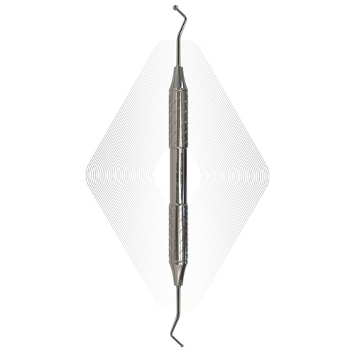 Dette dobbeltendede instrument kombinerer en stopper og en glitter med 1,5 mm og 2,5 mm kugleender. Det bruges til at komprimere restaureringsmateriale i kavitetspræparationer og til at udglatte og forme overfladen af komposit- eller amalgamrestaureringer. De afrundede ender giver kontrolleret tilpasning og hjælper med at skabe en velkontureret, poleret overflade.