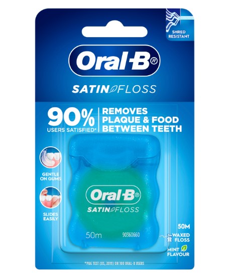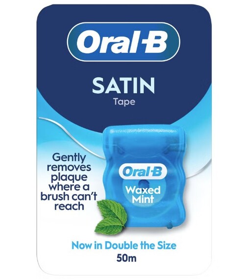 Oral-B Satin Floss er en vokset tandtråd i et bredere “tape”-format, udviklet til effektiv rengøring af interdentale rum – også i trange kontaktpunkter. Som et supplement til den daglige tandbørstning.