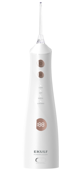 EKULF PowerFlosser Premium er en kraftfuld og elegant interdental munddouch/vandsprayflosser, der fjerner plak og bakterier mellem tænderne og dybt ned i tandkødslommerne, hvor almindelig tandtråd ikke kan nå. Med 4 specialtilpassede spidser, justerbar trykintensitet og en rummelig 270 ml vandtank tilbyder denne premiumversion maksimal rengøring og komfort. Med en kraftfuld, ultrafin vandstråle (0,65 mm) kombineret med pulserende teknologi hjælper PowerFlosser Premium med effektivt at fjerne plak, stimulere blodcirkulationen og modvirke betændelse i tandkødet. Perfekt også til dig med bøjle, broer, implantater eller følsomt tandkød.