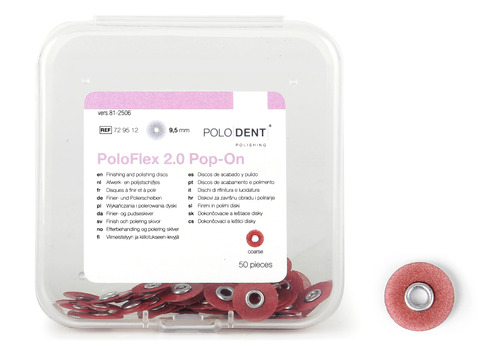 PoloDent PoloFlex 2.0 Pop-On pudseskive til efterbehandling og polering af kompositfyldninger. Enkelt-sidet skive, der er hurtig at fastgøre, nem at vende og beskytter tilstødende tænder under polering. Den fleksible skive roterer jævnt uden at afgive slibekorn og giver god kontrol selv i trange rum.