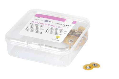 PoloDent PoloFlex 2.0 Pop-On pudseskive til efterbehandling og polering af kompositfyldninger. Enkelt-sidet skive, der er hurtig at fastgøre, nem at vende og beskytter tilstødende tænder under polering. Den fleksible skive roterer jævnt uden at afgive slibekorn og giver god kontrol selv i trange rum.